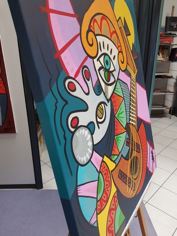 “Arlecchino, la chitarra e la Luna” misura 80 x 100 cm ed è realizzato con la tecnica dei colori da tatuaggio ed acrilici su tela.