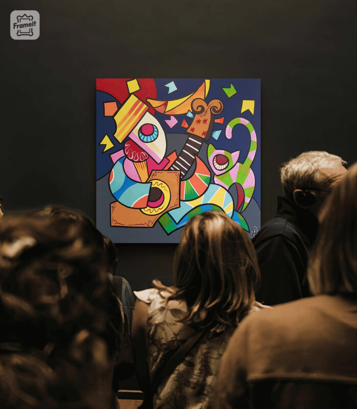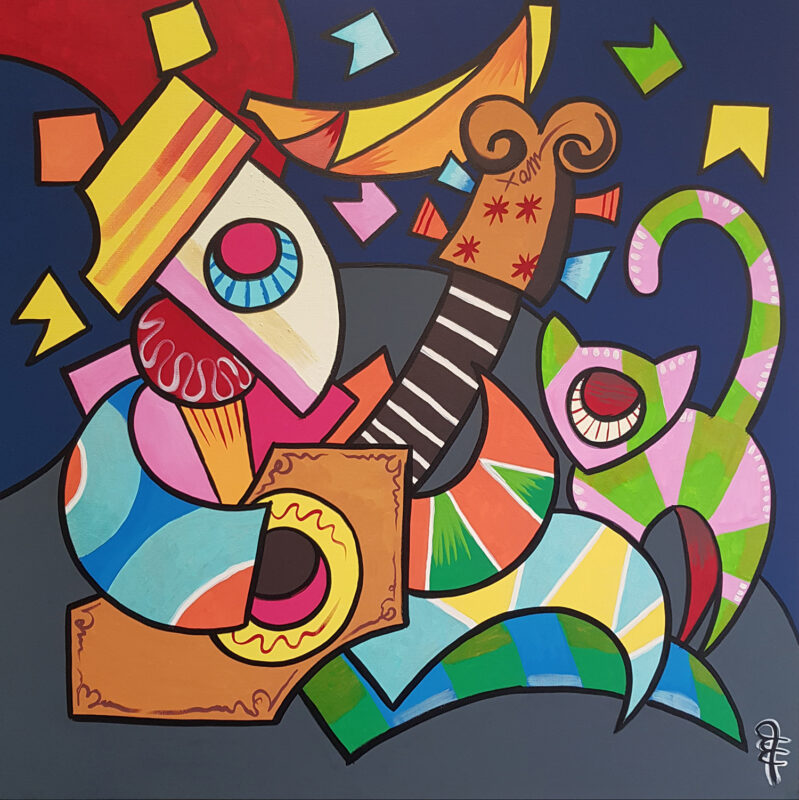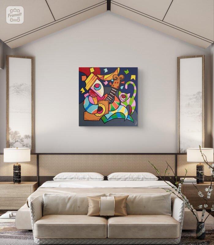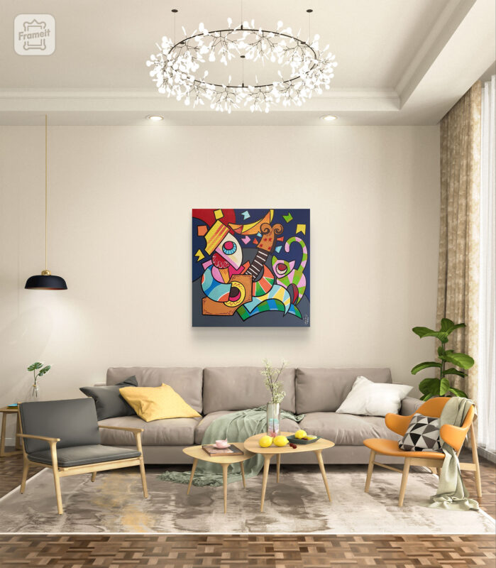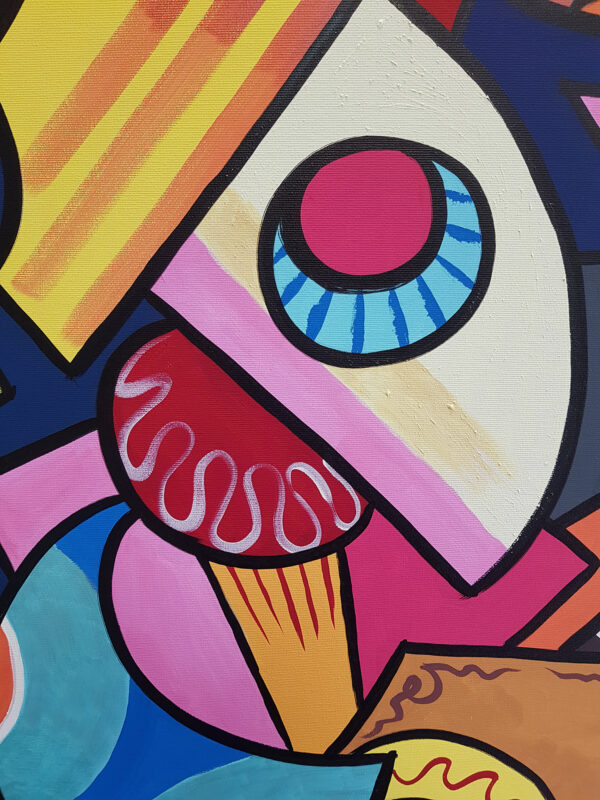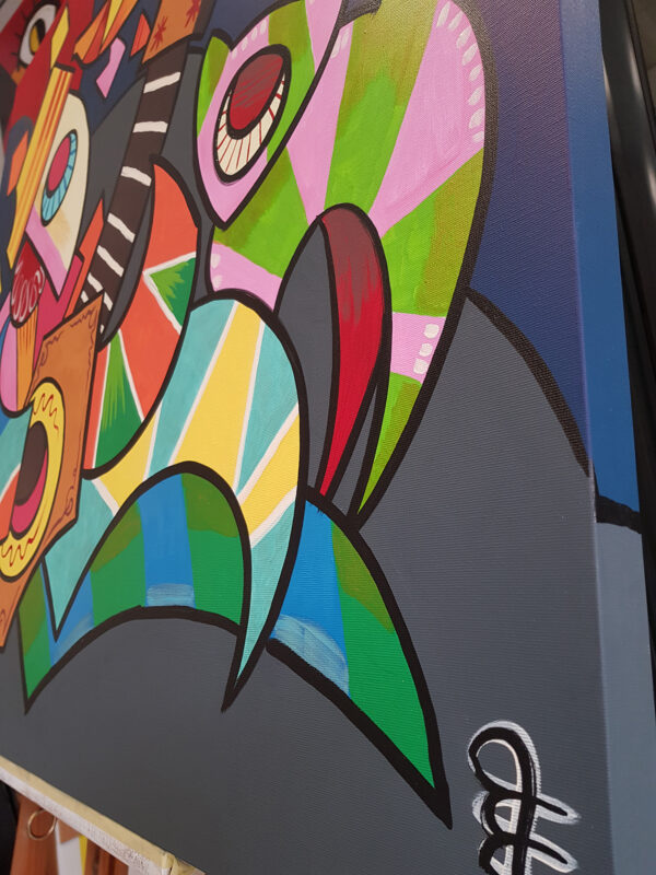 Non necessita di cornice in quanto la tela è spessa 4 cm. Colorata e scherzosa, questa opera porterà leggerezza ed allegria nella stanza che la ospiterà.
