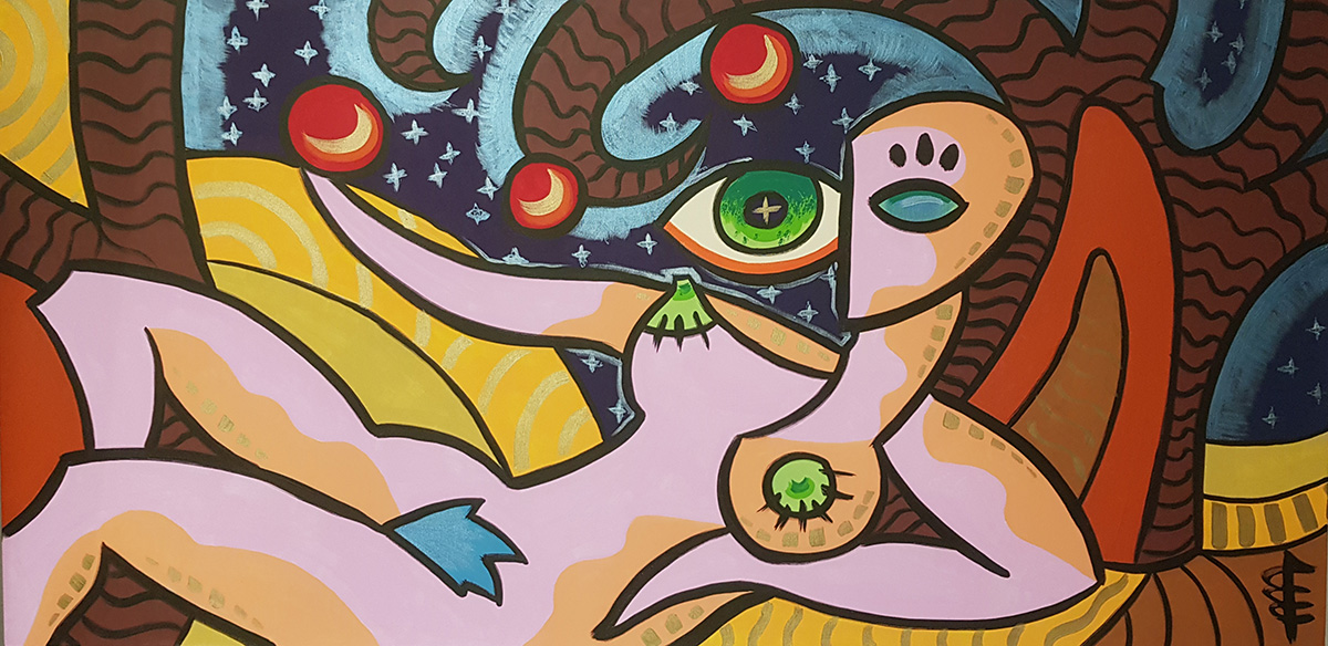 Quando dipingo, parto dalle sensazioni ed arrivo all’opera stessa. Come nel caso di questa opera, spesso è il supporto a parlare, con una visione proiettata su di esso, che mi suggerisce i tratti principali. Non posso dire però di entrare in una sorta di trance, anzi mi diverto dipingendo ad interagire con ciò che mi circonda.