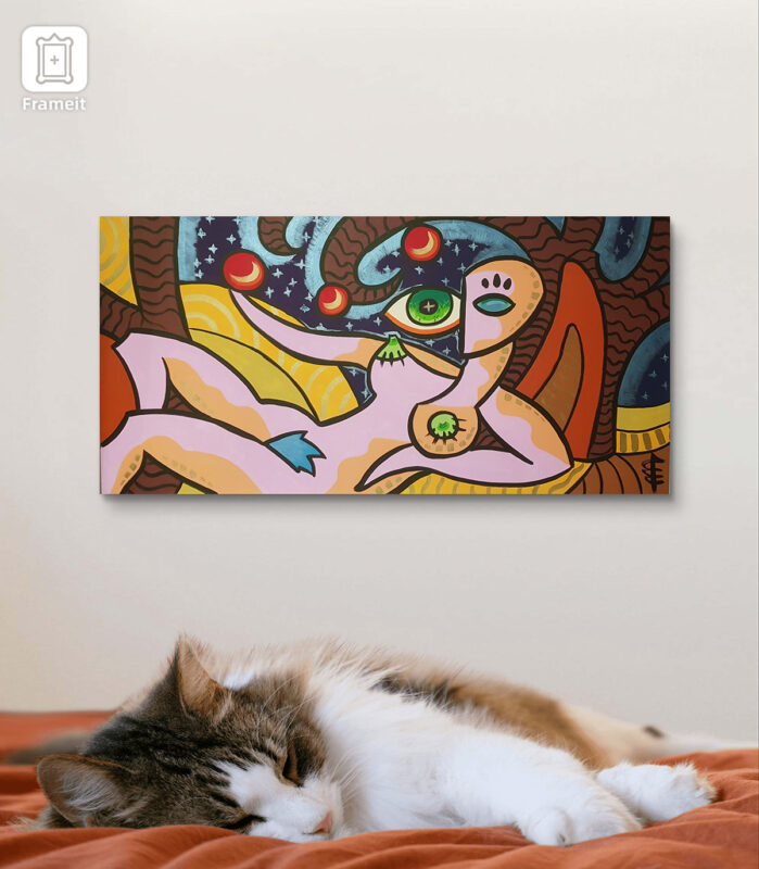 “Contemplazione della mela” è un’opera di misura media, 60 x 120 x 4 cm, pensata per una camera da letto, uno studio o comunque un locale aperto al pubblico: puoi commissionarla comunque anche di maggiori dimensioni o di un altro formato, sarò felice di accontentarti.