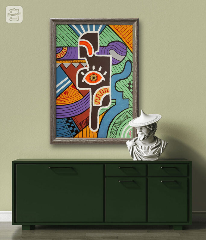 Questa ricerca mi diede un grosso spunto artistico, uno stimolo fortissimo per dirigere la mia arte verso una ricerca più intima e trascendentale, allo scopo di fissare attraverso una simbologia codificata la mia esperienza personale, riversandola su tela o altri supporti. questo quadro di dimensioni 70 x 100 cm è realizzato con inchiostri da tatuaggio ed acrilici su tela, ottimo per pareti medio piccole, si accompagna ad un arredamento moderno ma, con la giusta cornice lo vedrei anche in un ambiente più classico.