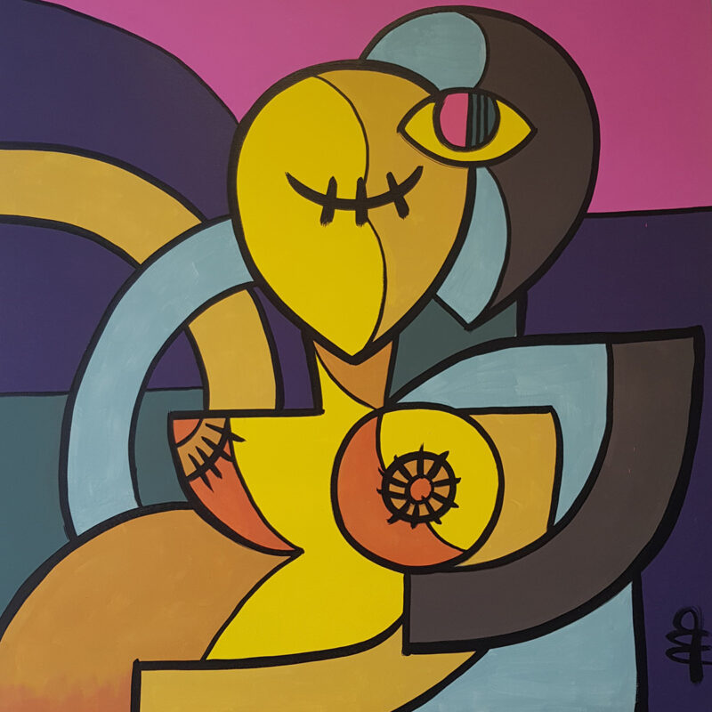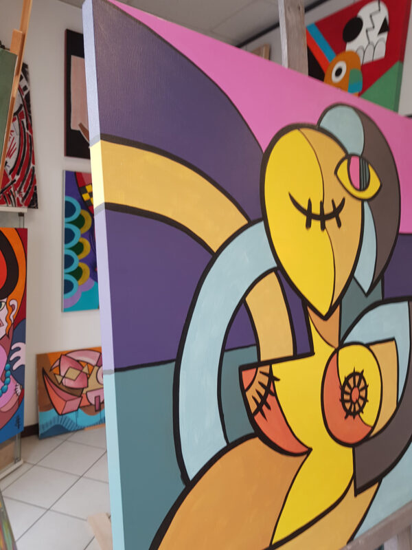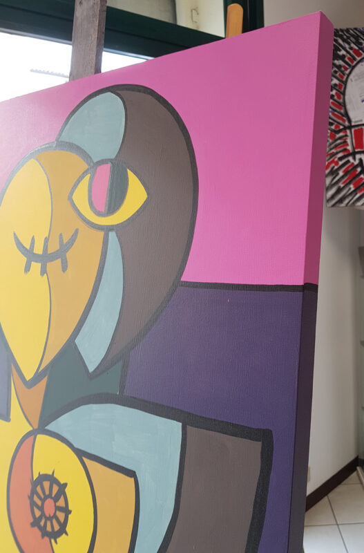 “Famiglia”è un quadro di 80 x 80 x 3 cm su tela riciclata, non necessita di cornice perché anche il lato del telaio è dipinto.