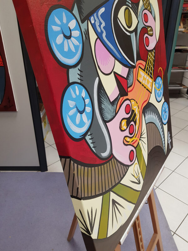 “Pulcinella suona la chitarra” misura 80 x 100 cm ed è realizzato con la tecnica dei colori da tatuaggio ed acrilici su tela. Non necessita di cornice in quanto la tela è spessa 4 cm. Colorata e scherzosa, questa opera porterà leggerezza ed allegria nella stanza che la ospiterà.
