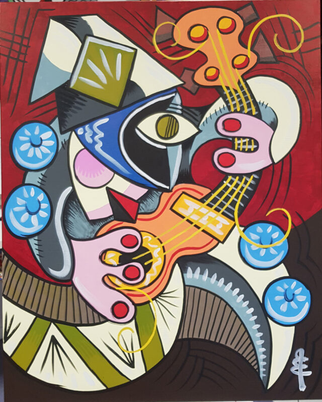 “Pulcinella suona la chitarra”: fa parte di una serie di miei quadri sul tema “maschere”, un tema a me molto caro, tuttora in lavorazione e che spero mi accompagnerà per molto tempo.